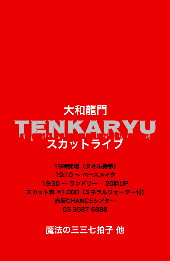 大和龍門スカットライブ TENKARYUライブハウス道場 魔法の三三七拍子 他 19:00開場(タオル持参・動ける服装) 19:10 〜 ベースメイク 19:30 〜 ランドリー 20:00時UP スカット料 \1,000(ミネラルウォーター付) 赤坂CHANCEシアター 03 3587 6888 担当 橋